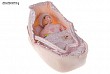 1 fotos Precio 22 € Cuna de tela de color rosa con bebé de 26 cm con su chupete y biberón.