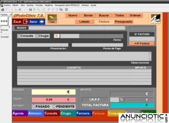 Software o Programa de Gestión de Podología Clínica Consultas de Podólogos @PodoClinic ¡¡ GRATIS !! fruto de la experiencia adquirida y siguiendo las recomendaciones de usuarios Podólogos, hemos desarrollado una herramienta específica para la Especialidad de Podología, dispone de un módulo de Consulta que gestiona toda la información que necesita un Podólogo, incluso hemos incorporado un Podograma compuesto de los módulos agenda admisión consulta podológica revisiones pruebas facturación compañías imagen y farmacia con vademecum. Personalice su documentación. Importe la información de otras Bases de Datos. Multiusuario y trabaje simultáneamente. Busque registros fácilmente. Módulos diferenciados por colores.